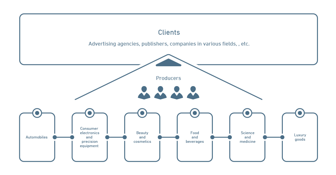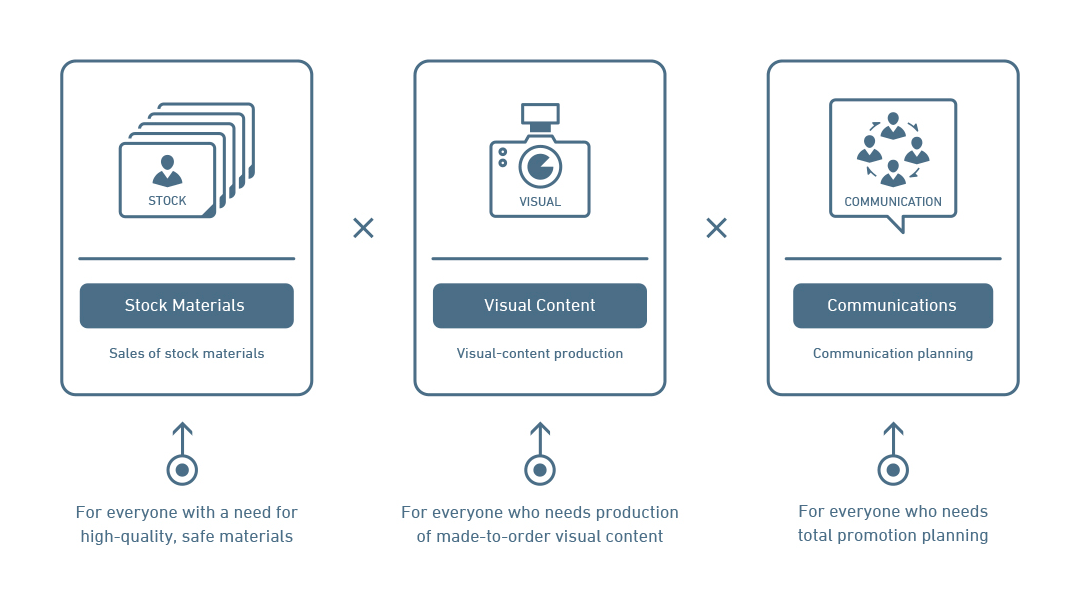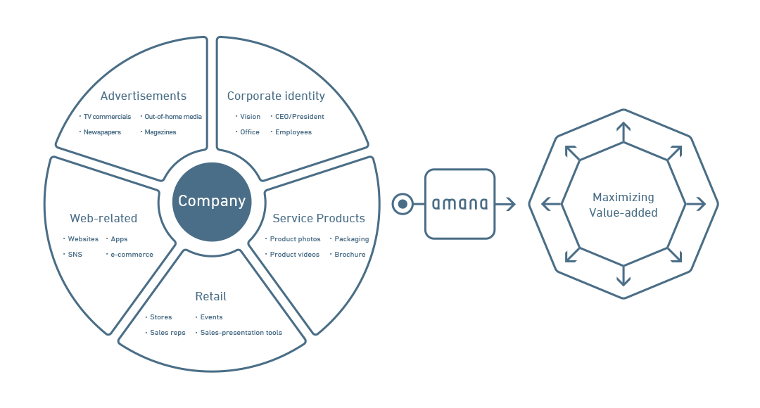 We provide services tailored to your company's issues and needs, focusing on three fields: Stock materials, visual content and communications. We propose best solutions, customizing 60+ amana creative services to cater to various clients' needs.