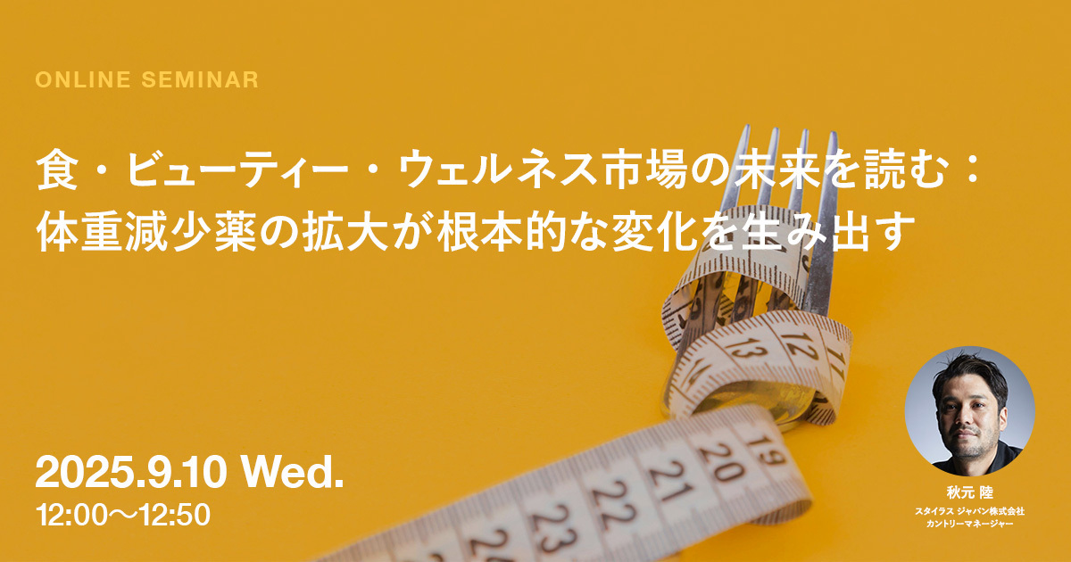 本セミナーでは、世界的なマーケットトレンドを研究するイノベーションアドバイザリー「STYLUS」の秋元陸氏を迎え、体重減少薬を利用している消費者向けの商品開発で先行している欧米の、各市場の動向と、新薬クラス登場によって予測される未来について考察します。