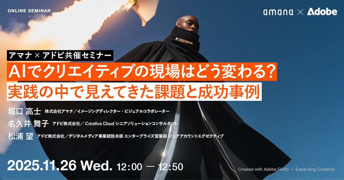 コミュニケーション変革をクリエイティブで実現する株式会社アマナ(本社:東京都品川区、代表取締役社長:金子剛章、以下「アマナ」)は、アドビ株式会社と共同で、2025年11月26日(水)、「AIでクリエイティブの現場はどう変わる?実践の中で見えてきた課題と成功事例」をテーマにオンラインセミナーを開催します。