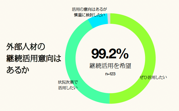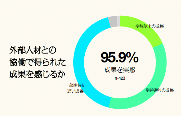 本調査では、外部人材を受け入れた企業の95.9%が「期待成果あり」と回答し、99.2%が今後も活用意向を示すなど、外部人材との協働に対する高い満足度と継続意欲が明らかになりました。
