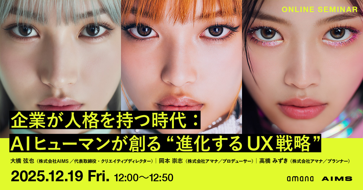 コミュニケーション変革をクリエイティブで実現する株式会社アマナ(本社:東京都品川区、代表取締役社長:金子剛章、以下「アマナ」)は、2025年12月19日(金)、「企業が人格を持つ時代:AIヒューマンが創る“進化するUX戦略」をテーマにオンラインセミナーを開催します。