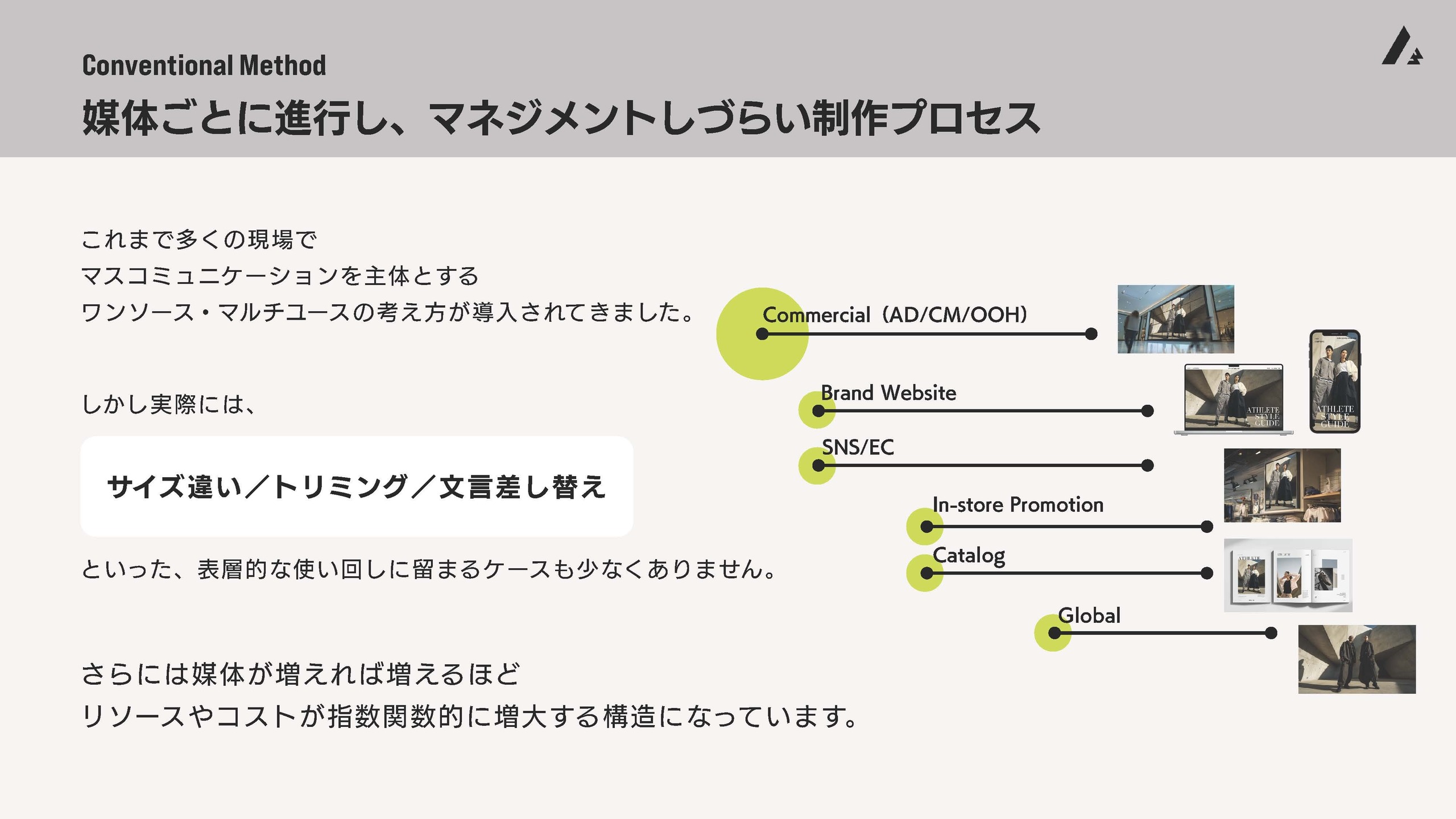 制作コストが増大し続ける従来の構造を見直し、クリエイティブの価値を最大化する新たな制作スタンダードを提案します。