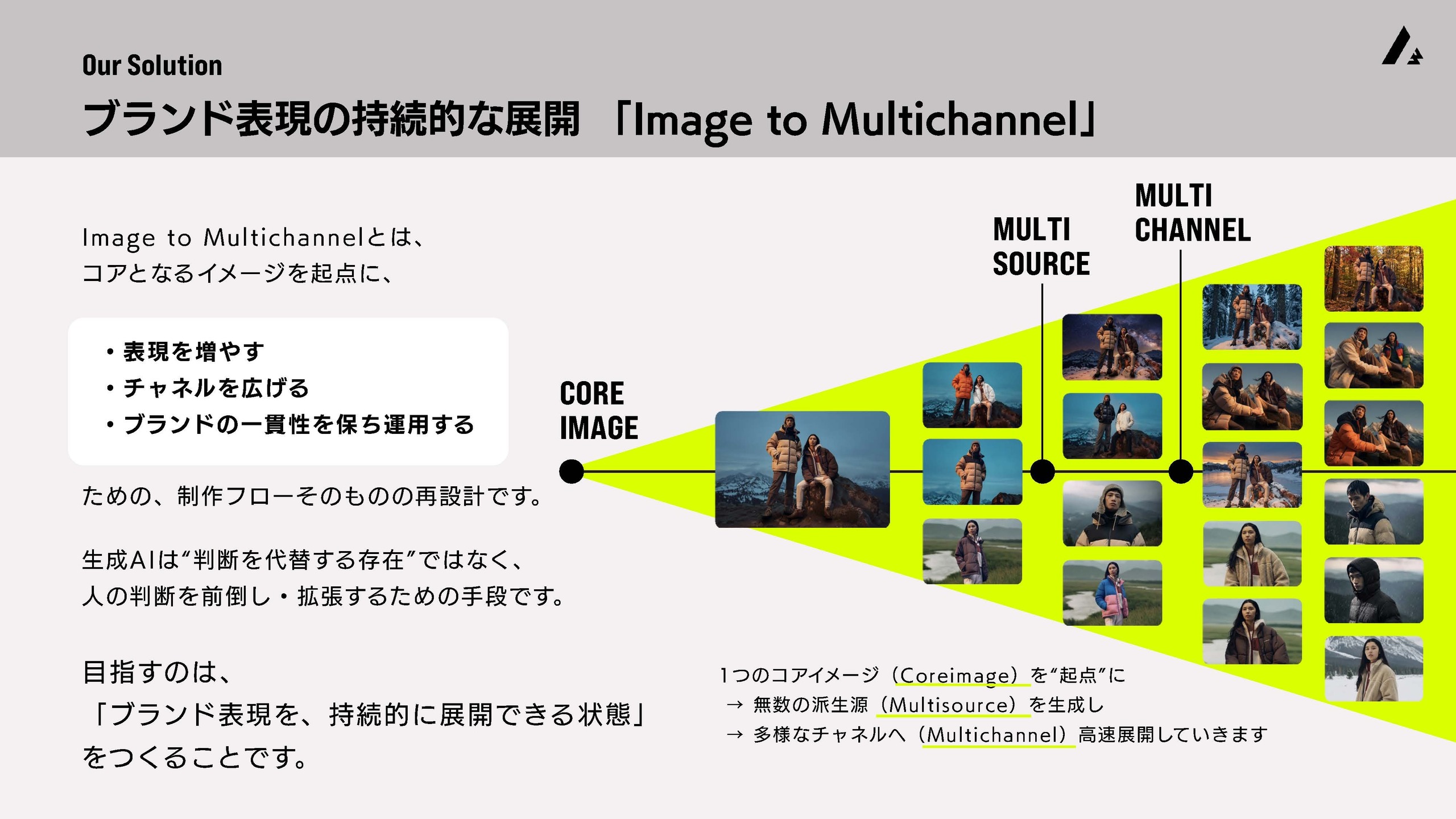 A³が提唱する「Image to Multichannel」は、ブランドの思想を凝縮した一つのコアビジュアルを起点に、媒体特性や利用シーンに応じた表現をシームレスに展開する制作アプローチです。AIの生成力とプロの編集技術を掛け合わせることで、表現の一貫性を保ちながら、あらゆるチャネルへの迅速な適応を可能にします。