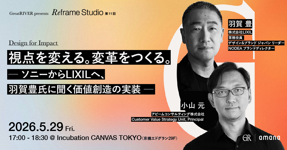 コミュニケーション変革をクリエイティブで実現する株式会社アマナ(本社:東京都品川区、代表取締役社長:金子剛章、以下「アマナ」)は、2026年5月29日(金)、「視点を変える。変革をつくる。 ─ ソニーからLIXILへ、羽賀豊氏に聞く価値創造の実装 ─ Great RIVER presents〈Reframe Studio〉第11回」をテーマにセミナーを開催します。