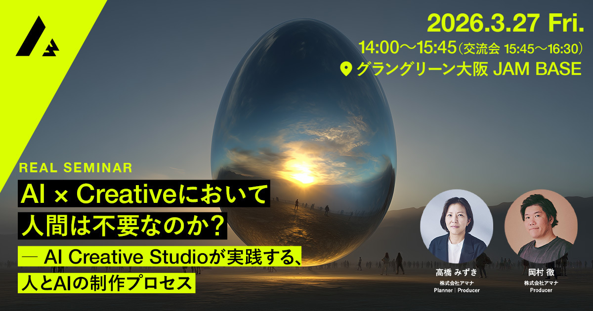 コミュニケーション変革をクリエイティブで実現する株式会社アマナ(本社:東京都品川区、代表取締役社長:金子剛章、以下「アマナ」)は、2026年3月27日(金)、「AI × Creativeにおいて人間は不要なのか? ─ AI Creative Studioが実践する、人とAIの制作プロセス」をテーマにセミナーを開催します。