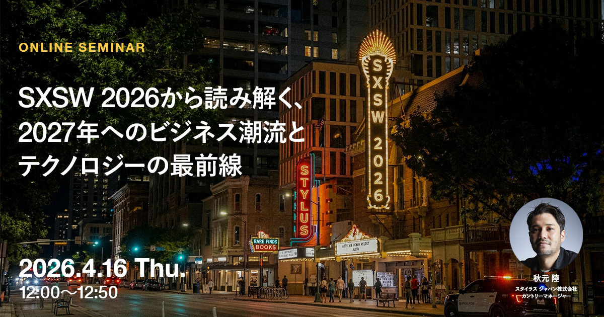 本ウェビナーでは、世界的なマーケットトレンドを研究するイノベーションアドバイザリー「STYLUS」の秋元陸氏をゲストに迎え、2026年のSXSWにおける主要な論点や今年の注目分野についてレポートします。毎年のSXSW調査から得られたインサイトと、今年のトレンドとの対比を通じて、貴重な洞察を提供します。