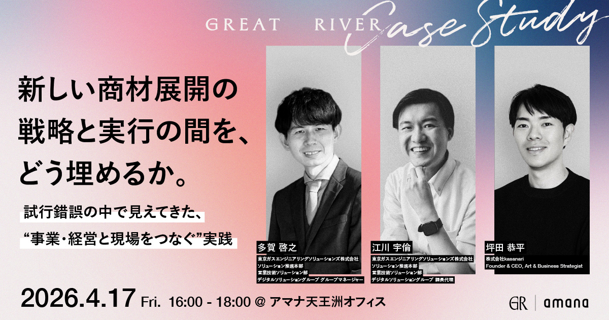 コミュニケーション変革をクリエイティブで実現する株式会社アマナ(本社:東京都品川区、代表取締役社長:金子剛章、以下「アマナ」)は、2026年4月17日(金)、「Great RIVER Case Study 新しい商材展開の戦略と実行の間を、どう埋めるか。 ― 試行錯誤の中で見えてきた、“事業・経営と現場をつなぐ”実践 ―」をテーマにセミナーを開催します。