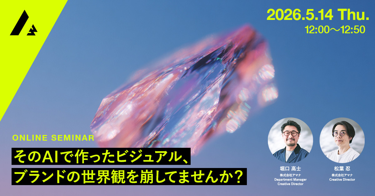 コミュニケーション変革をクリエイティブで実現する株式会社アマナ(本社:東京都品川区、代表取締役社長:金子剛章、以下「アマナ」)は、2026年5月14日(木)、『そのAIで作ったビジュアル、ブランドの世界観を崩してませんか?』をテーマにオンラインセミナーを開催します。