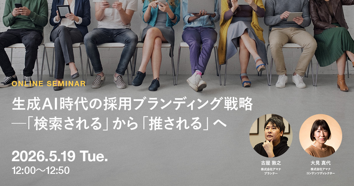 コミュニケーション変革をクリエイティブで実現する株式会社アマナ(本社:東京都品川区、代表取締役社長:金子剛章、以下「アマナ」)は、2026年5月19日(火)、『生成AI時代の採用ブランディング戦略 ─「検索される」から「推される」へ』をテーマにオンラインセミナーを開催します。
