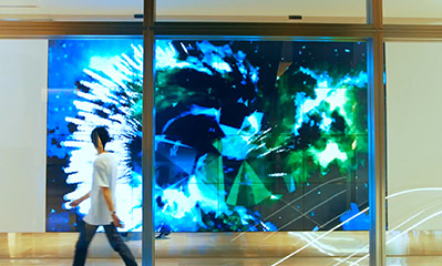 16面液晶マルチディスプレイを使用し、人が通ると位置を認識して、インタラクティブに映像を変化させる仕組みをつくりました。