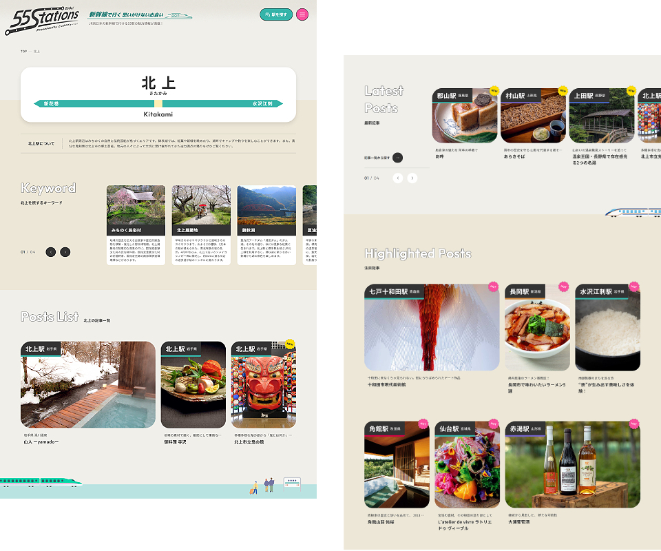 Kappo、KURA、月刊新潟Komachiなど地域の魅力に精通したメディアと連携し、旅に行きたい気持ちをより高める良質な地域密着型記事を80本以上ディレクション・制作進行。ロゴやWebデザインも見やすさとわくわく感にこだわりました。JR東日本管内の新幹線が停車する全55駅それぞれに焦点をあて、多彩な切り口で魅力を発信することにより、訪問のきっかけづくりを目指しています。